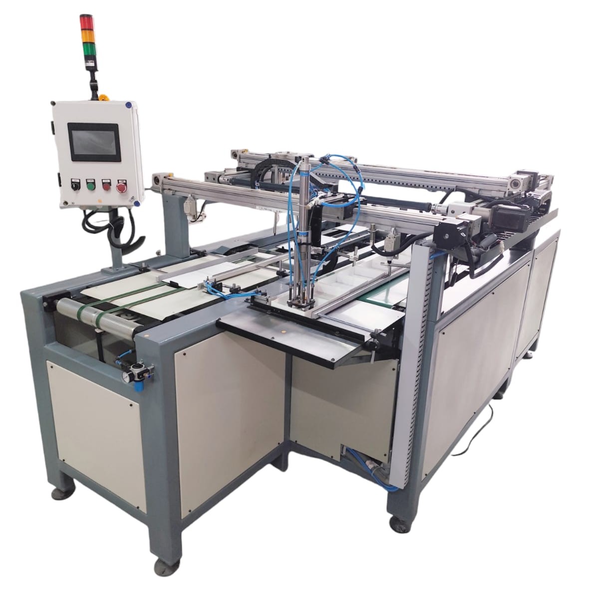 'Case' comes in position on the conveyor. Glue is applied by the system as programmed, using a nozzle. 'Skeleton box' is placed accurately on the glued area by the system as programmed. When one cycle is completed, the 'case along with the box', move forward on the conveyor and the next 'case' comes in position on the conveyor, for the next cycle of operation.